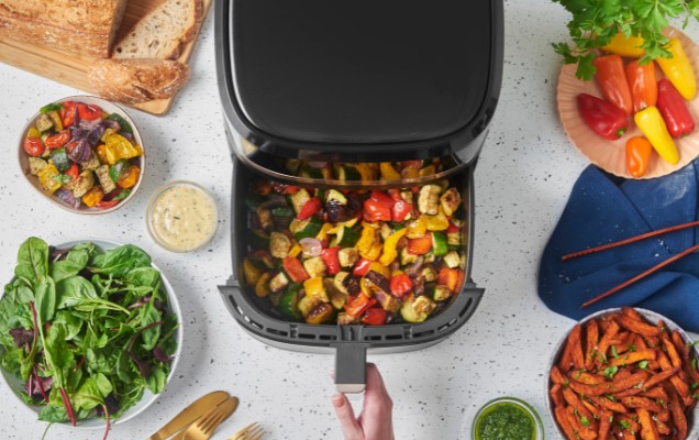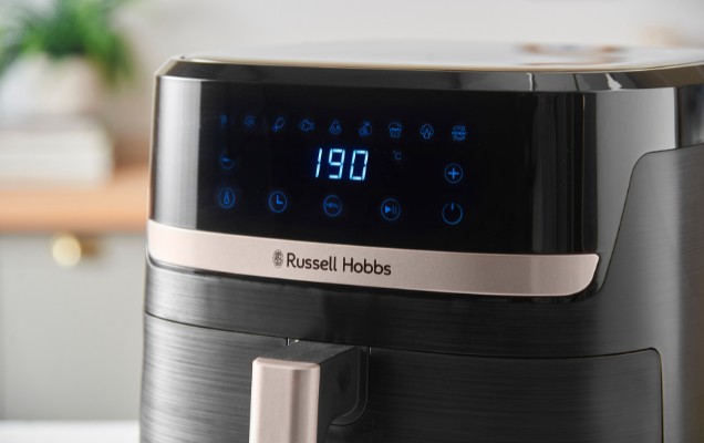 Cu accente de șampanie în contrast cu exteriorul negru clasic, această friteuză cu aer cald va arăta elegant pe blatul dvs. de lucru și va completa orice stil de bucătărie.