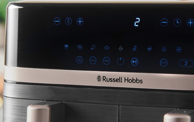 Friteuza cu aer cald Russell Hobbs Satisfry Dual Basket este gata să vă ducă gătitul la un alt nivel. Cele 2 coșuri, fiecare cu o capacitate amplă de 4,5 l, sunt adăpostite într-un cadru elegant, negru, cu accente de șampanie, care va arăta elegant în orice bucătărie. Ecranul tactil digital și comenzile de temperatură fac ca operarea celor 2 zone de gătit să fie rapidă și ușoară. Sincronizați ambele coșuri și lăsați Satisfry să se asigure că friptura suculentă și cartofii prăjiți wedges sunt gata în același timp. Sau potriviți setările pentru a găti același fel de mâncare în ambele coșuri atunci când o singură porție de tempura pur și simplu nu este suficientă. Cu 9 funcții presetate, componente care pot fi spălate în mașina de spălat vase și 2800 W la îndemână, mesele au devenit mult mai ușoare.