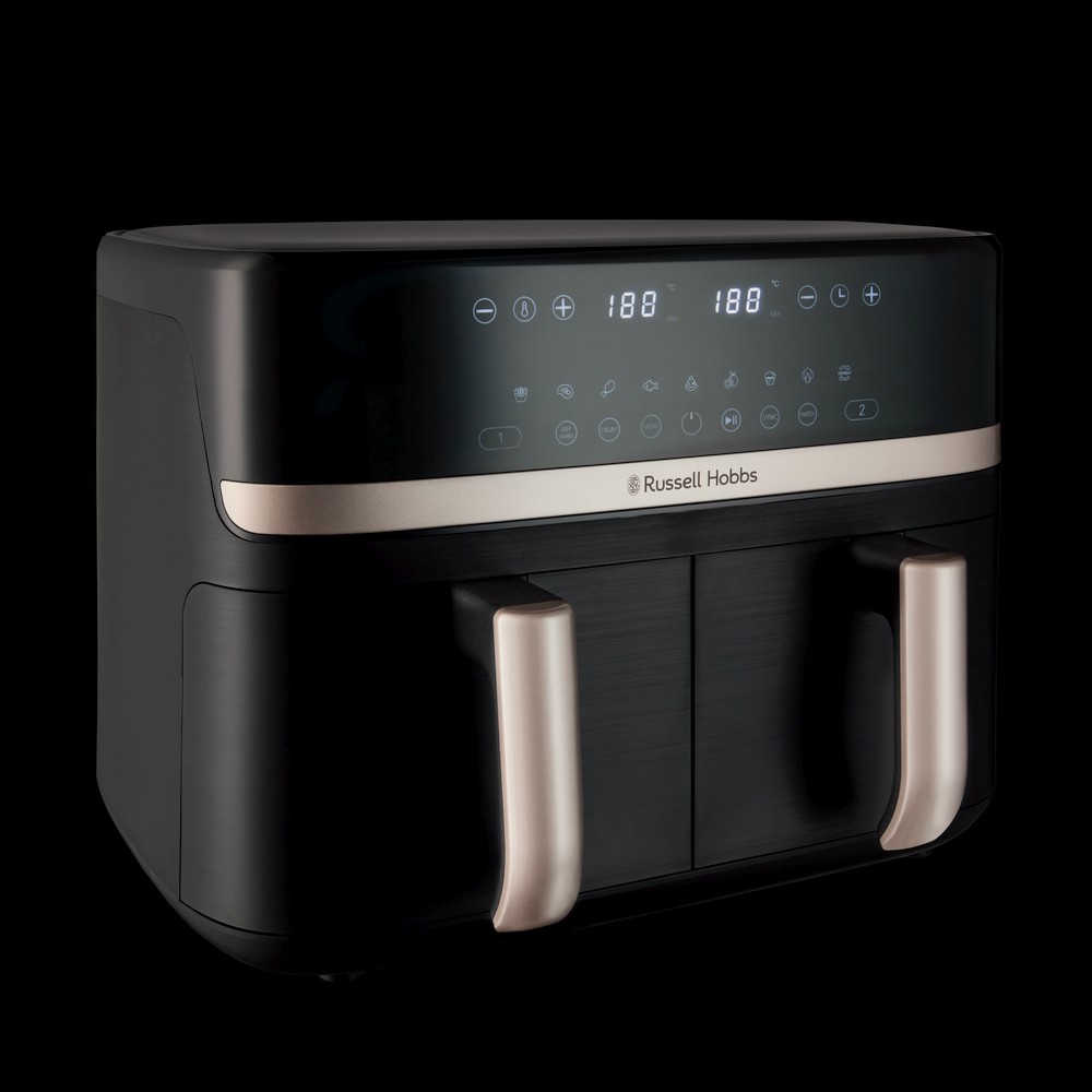 Gătiți ca un profesionist cu friteuza cu aer cald Russell Hobbs Satisfry Dual Basket. Cu o capacitate de 9 litri în 2 coșuri, această elegantă friteuză cu aer cald de culoare neagră, cu accente de șampanie, pregătește mâncărurile preferate ale familiei în cel mai scurt timp. Ecranul său tactil digital dispune de funcții inteligente de sincronizare și potrivire. Alegeți sincronizarea pentru a seta timpi și temperaturi de gătire diferite pentru fiecare coș și alegeți funcția match to mirror pentru a oglindi setările în ambele coșuri.