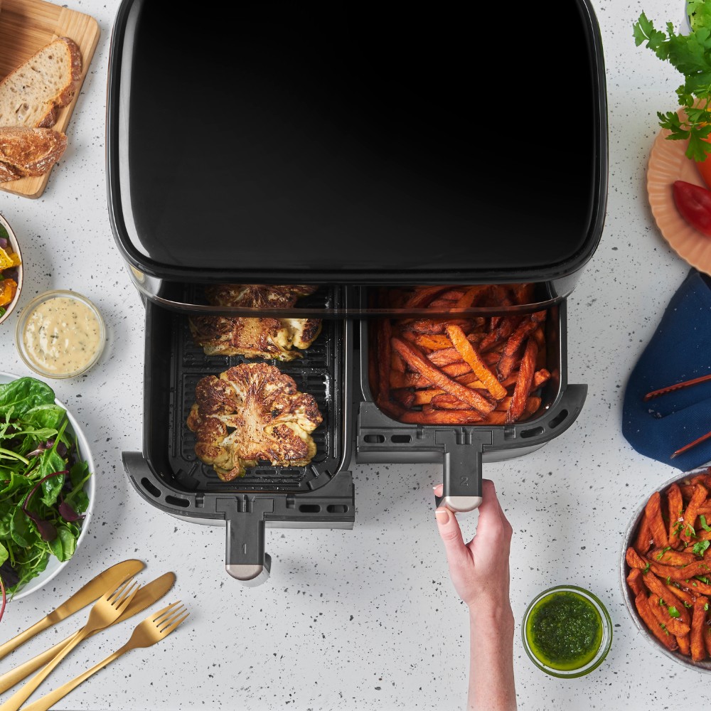 Ecranul tactil digital și comenzile de temperatură fac utilizarea acestei friteuze cu aer cald o joacă de copii. Cu un panou de control simplu și setări intuitive pentru ambele compartimente, programarea mesei preferate este o a doua natură.