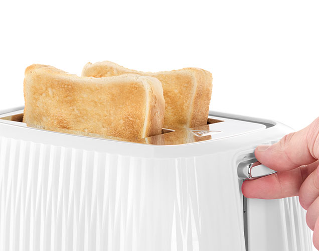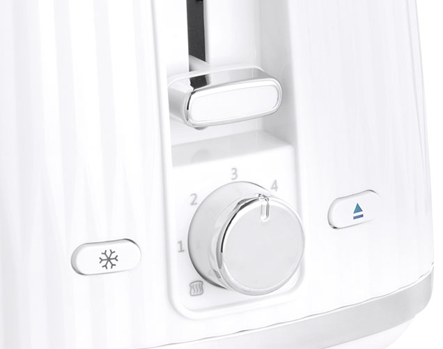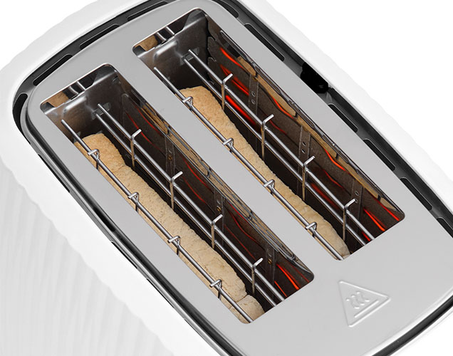 Cu accente cromate și caneluri texturate elegant în alb, acest prăjitor de pâine este o piesă de referință pentru o bucătărie elegantă.
