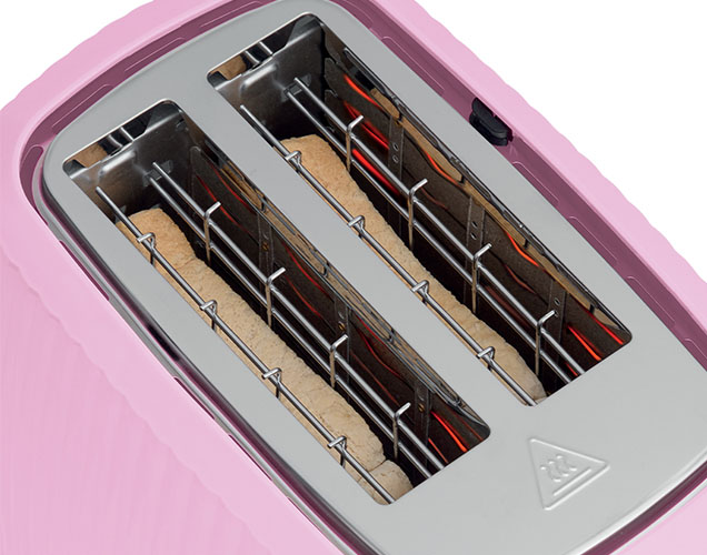 Cu accente cromate și caneluri texturate elegant în roz, acest prăjitor de pâine este o piesă de referință pentru o bucătărie elegantă.